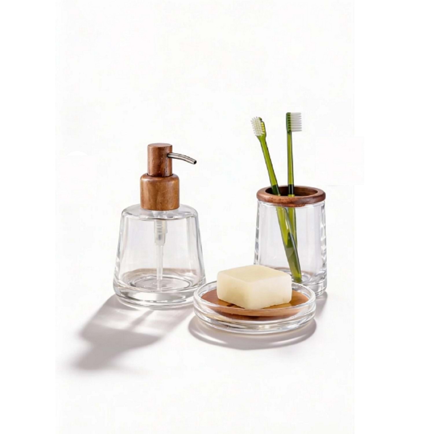 - Cam ve doğal ahşap malzemelerin zarif birleşiminden oluşan 3 parçalık banyo seti. - Cam materyali, şıklığı ve kolay temizlenebilirliği ile banyonuza modern bir dokunuş katıyor. - Doğal ahşap detaylar, banyo dekorasyonunuza sıcak ve doğal bir hava katıyor. - CN menşeili bu set, kaliteli işçiliği ve dayanıklılığı ile uzun süreli kullanım sunuyor.