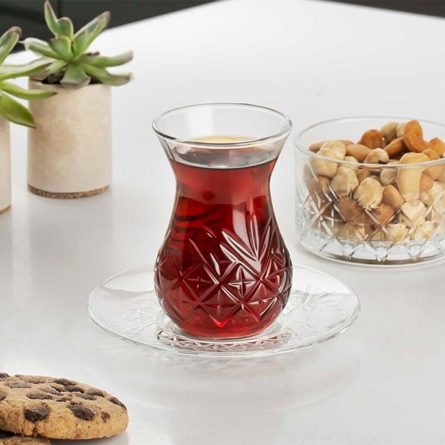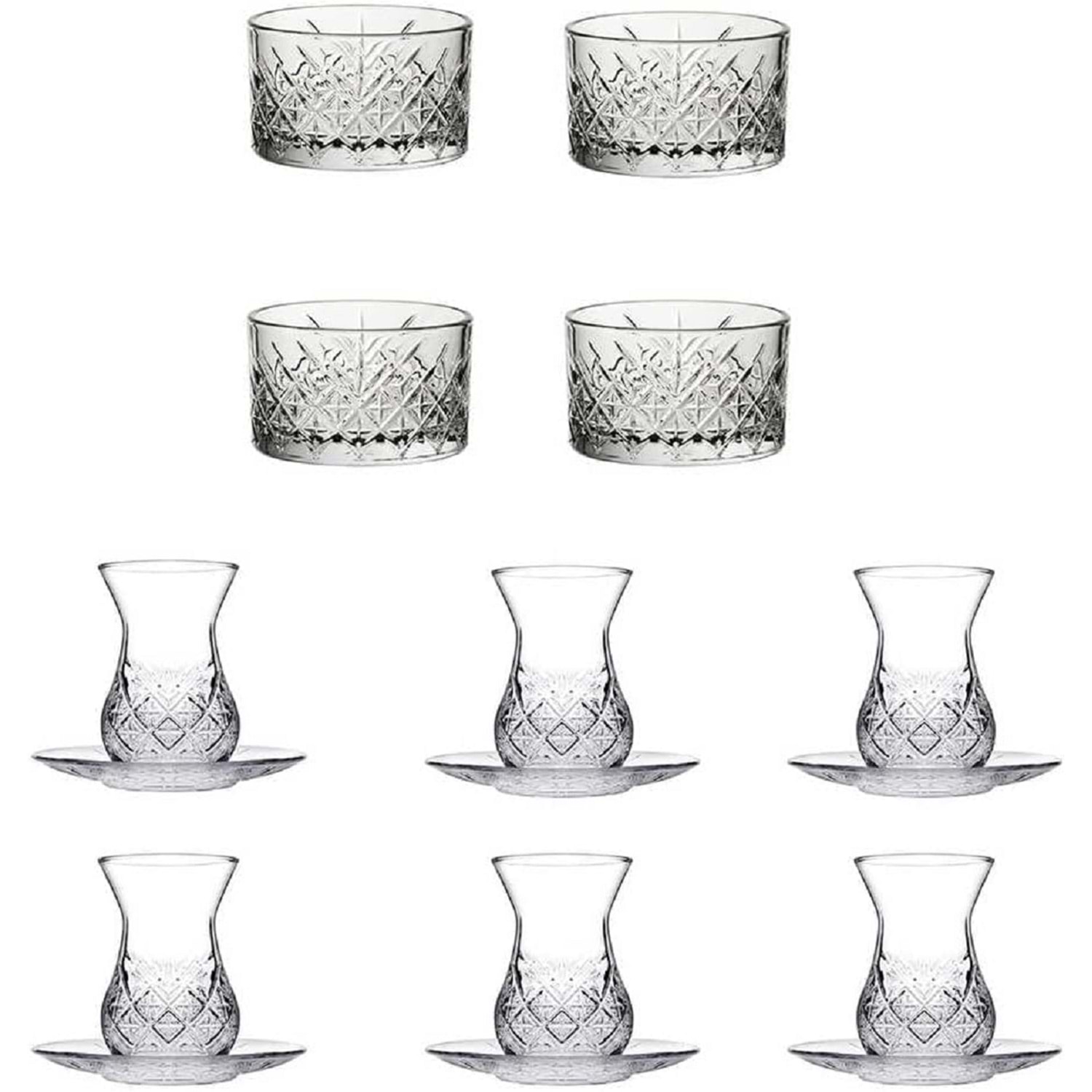 Paşabahçe Timeless 16 Parça Çerezlik Tatlı Sunum Kase Çay Bardak Tabak Takımı Kesme Kristal Çay Seti Ürün Özellikleri: Paşabahçe Timeless Set çay ve tatlı keyiflerinizi paşabahçe cam kalitesi ile birleştirip bir bütün haline getiriyor. Keskin tasarımlı kaseleriniz ve kesme kristal desenli çay bardaklarınız konuklarınız için hazırladığınız sunumlarda masanızda dikkat çekecek. Set 4 Adet kase 6 Adet çay bardağı 6 Adet çay tabağı içermektedir. Ürün Ölçüleri: Kase - 225 cc Çay Bardağı - 155 cc Çay Tabağı - 12.5 cm Toplam 16 parça ürün gönderilmektedir.