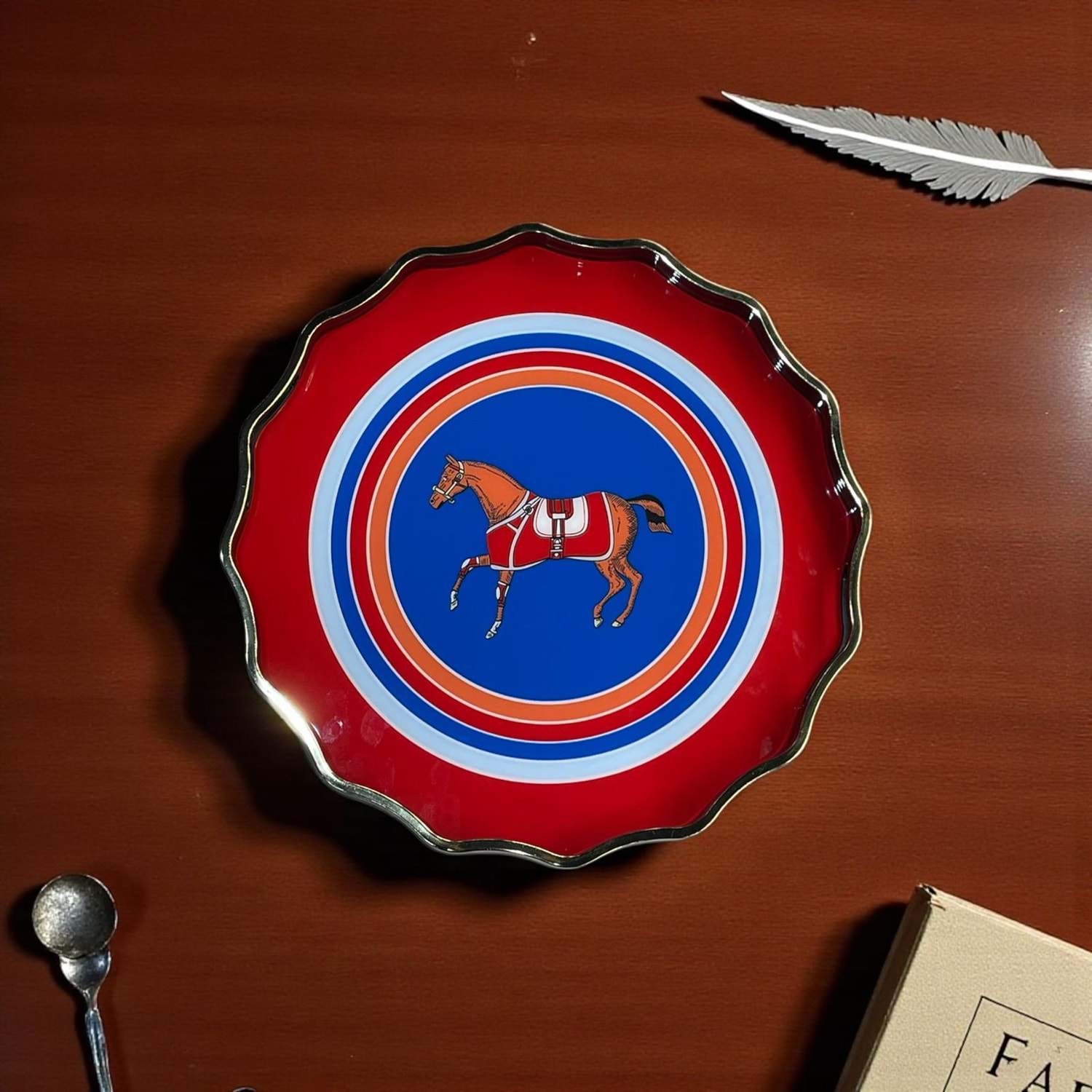 Özel Tasarım El Yapımı Ahşap , Cam Görünümlü Tepsi Horse Kırmızı Yuvarlak