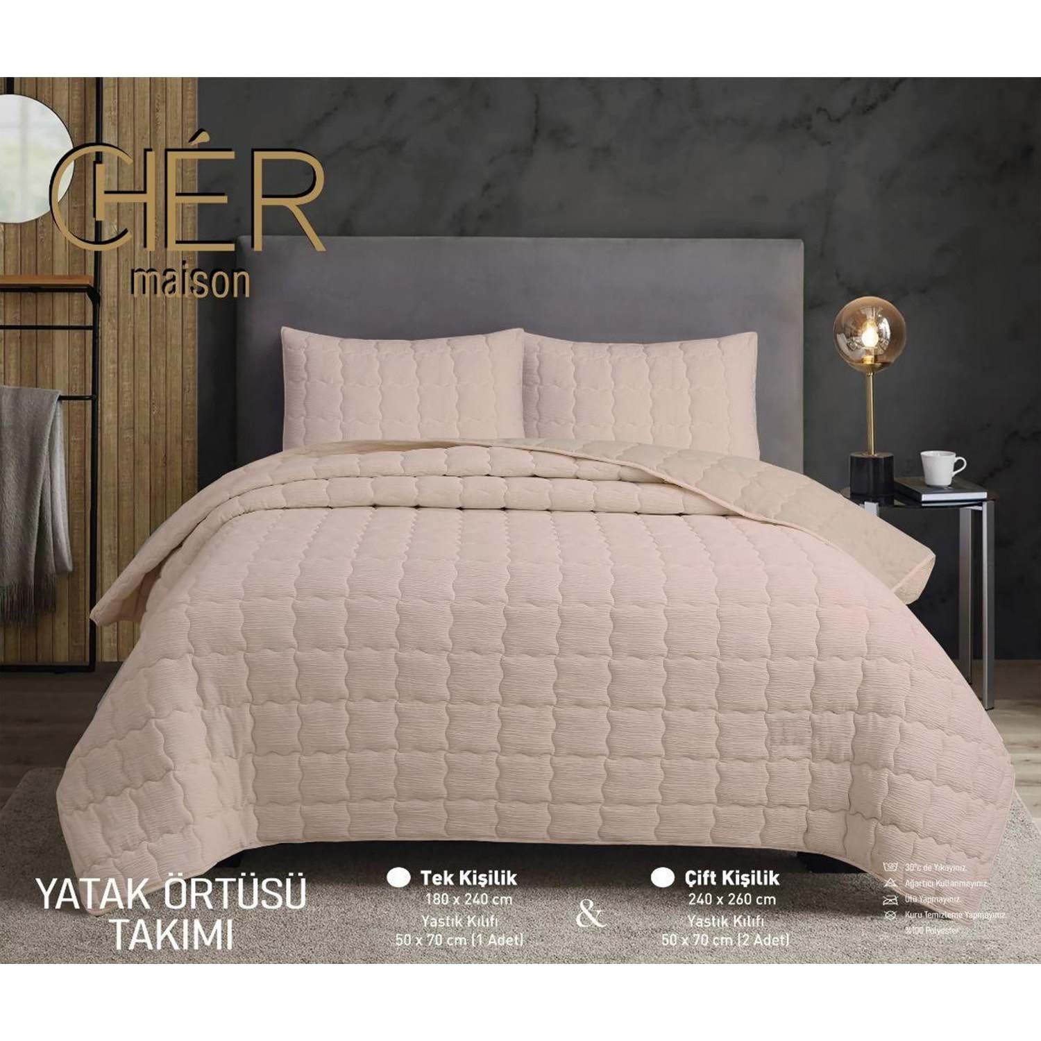Çok Amaçlı Yastık Kılıflı Çift Kişilik Yatak Örtüsü Pudra